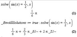 До тех пор пока не установлено (набрано) _EnvAllSolutions:=true, встроенная функция solve возвращает пользователю только одного представителя корней заданного тригонометрического уравнения. После данной команды она возвращает все множество корней для каждого тригонометрического уравнения